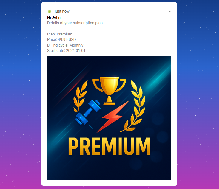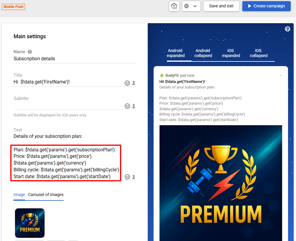 As an example, we'll use an order confirmation mobile push message and add dynamic subscription details to it.