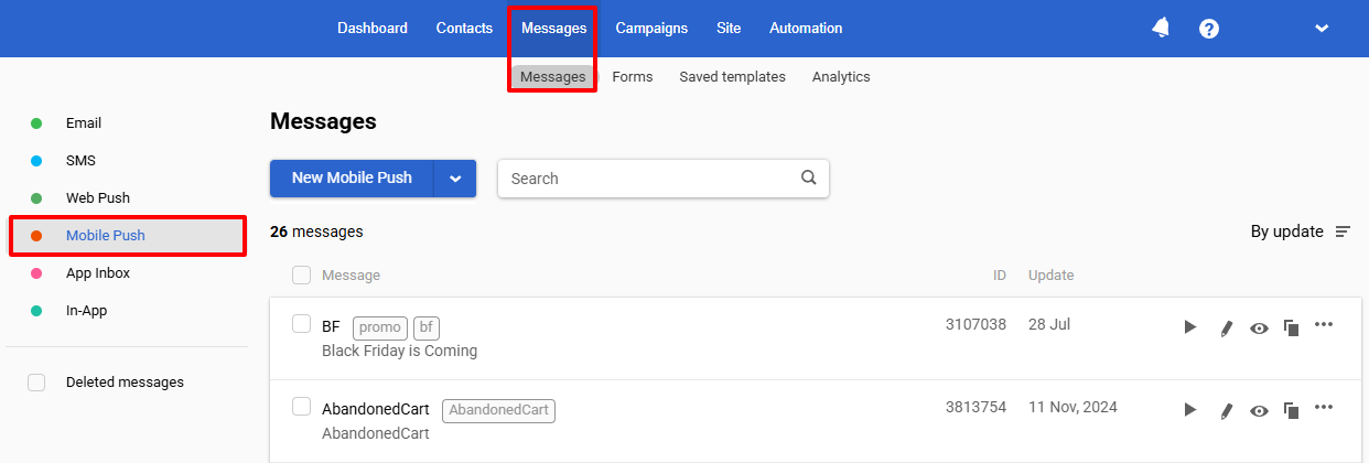- Go to Messages → Messages and open the necessary Mobile push or create a new one.