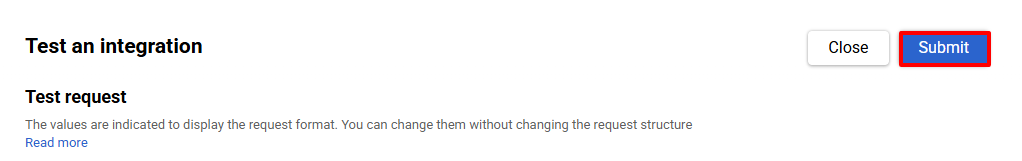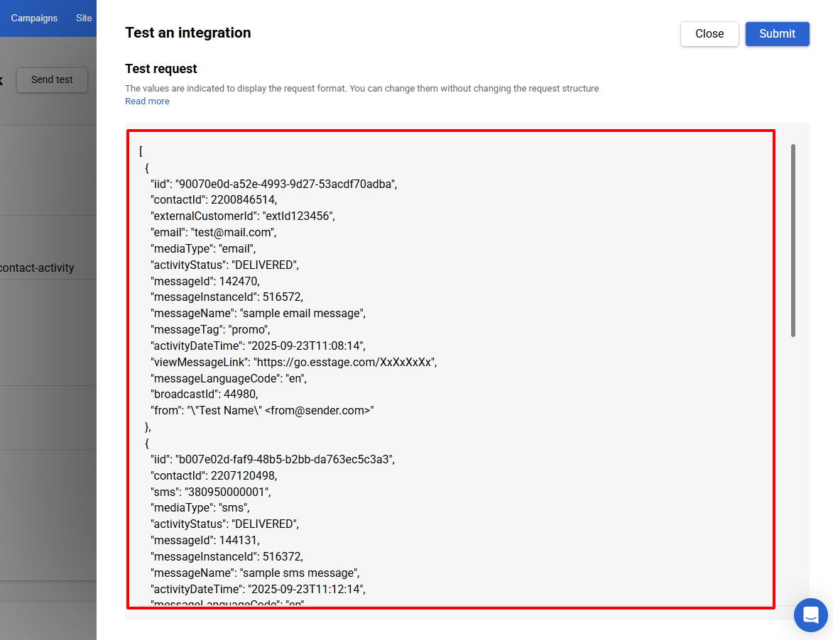 - In the Test an integration window, a test request will open. It contains a demo array with several objects — an example of how the system generates webhooks for different channels.