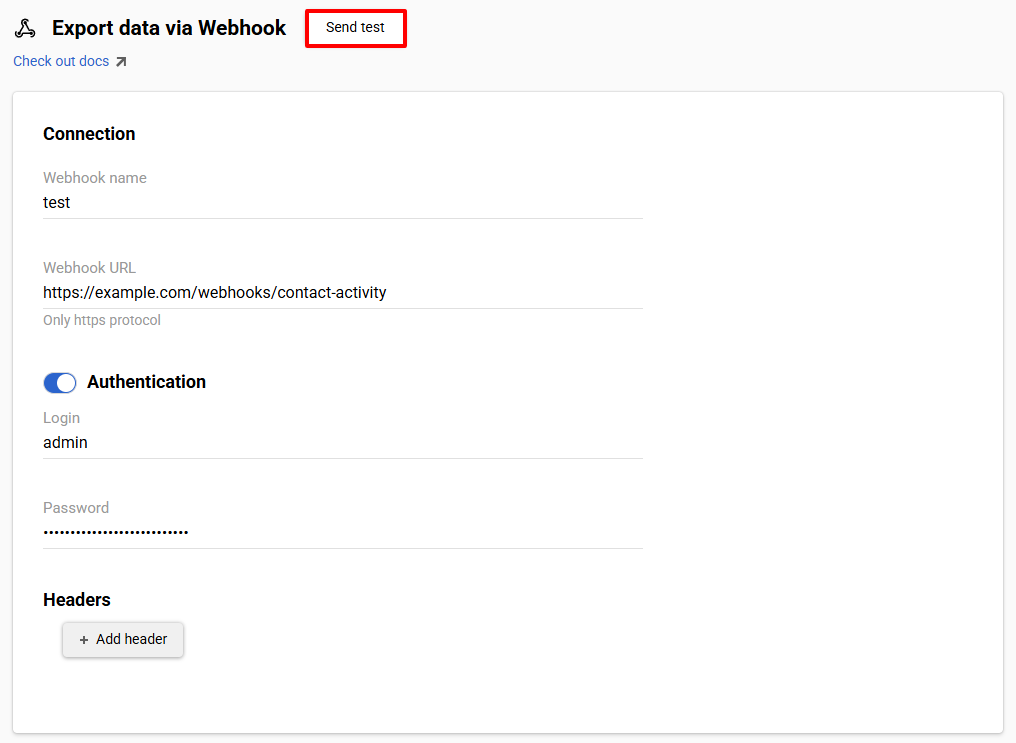 - Click Send test on the Data export via Webhook tab.