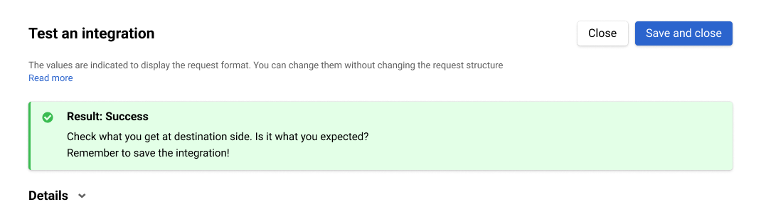 - click Save and close if the test was successful and the webhook works correctly;