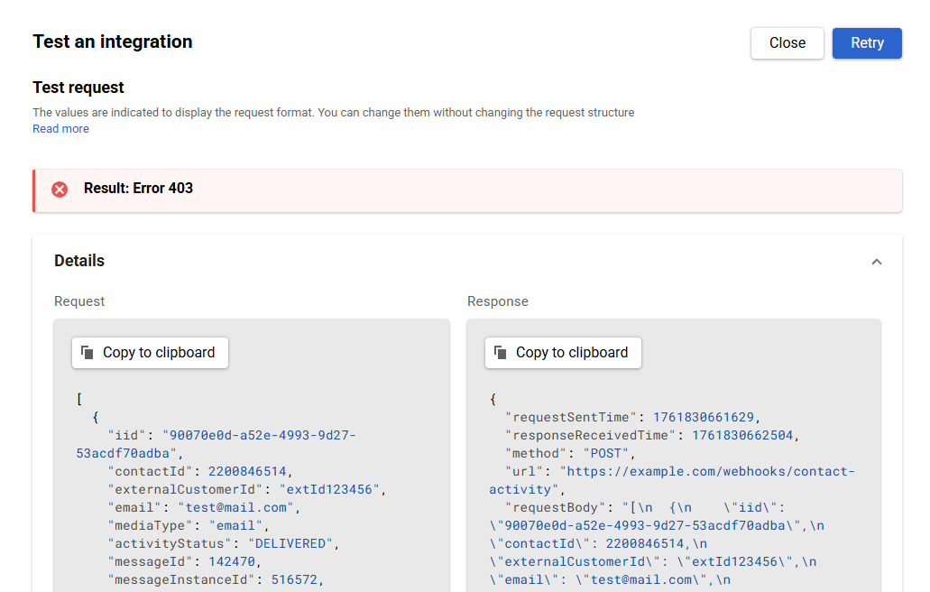 - if an error occurred — click Retry; or click Close, make adjustments to the configuration, and send the test request again.