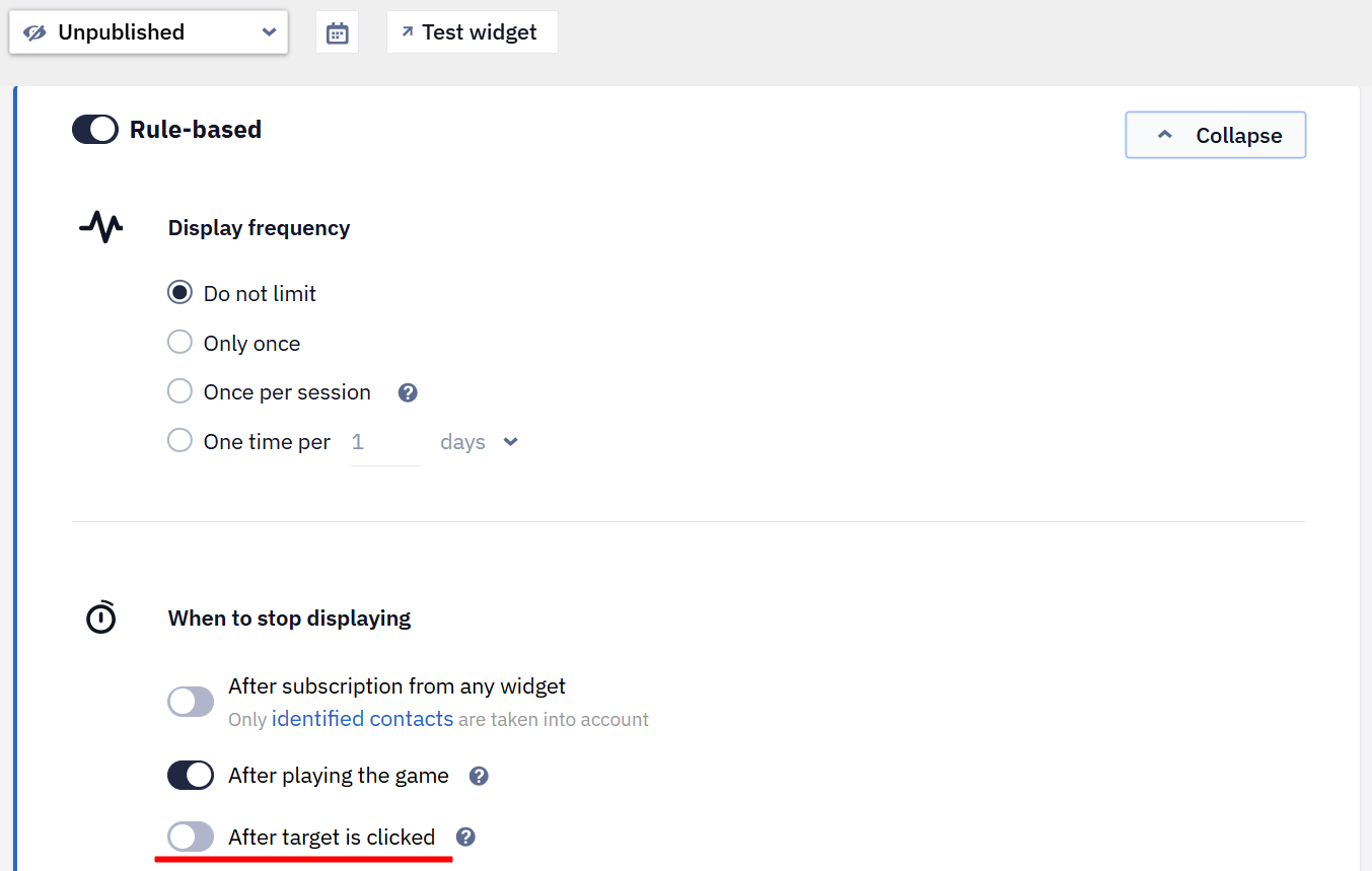Informers can now stop displaying as soon as a user completes a target action. The corresponding settings are configured in the widget calling rules: