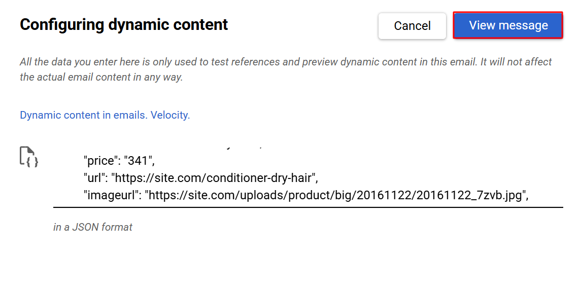 - In case of an error in the dynamic content substitution, check the Velocity syntax in the message.