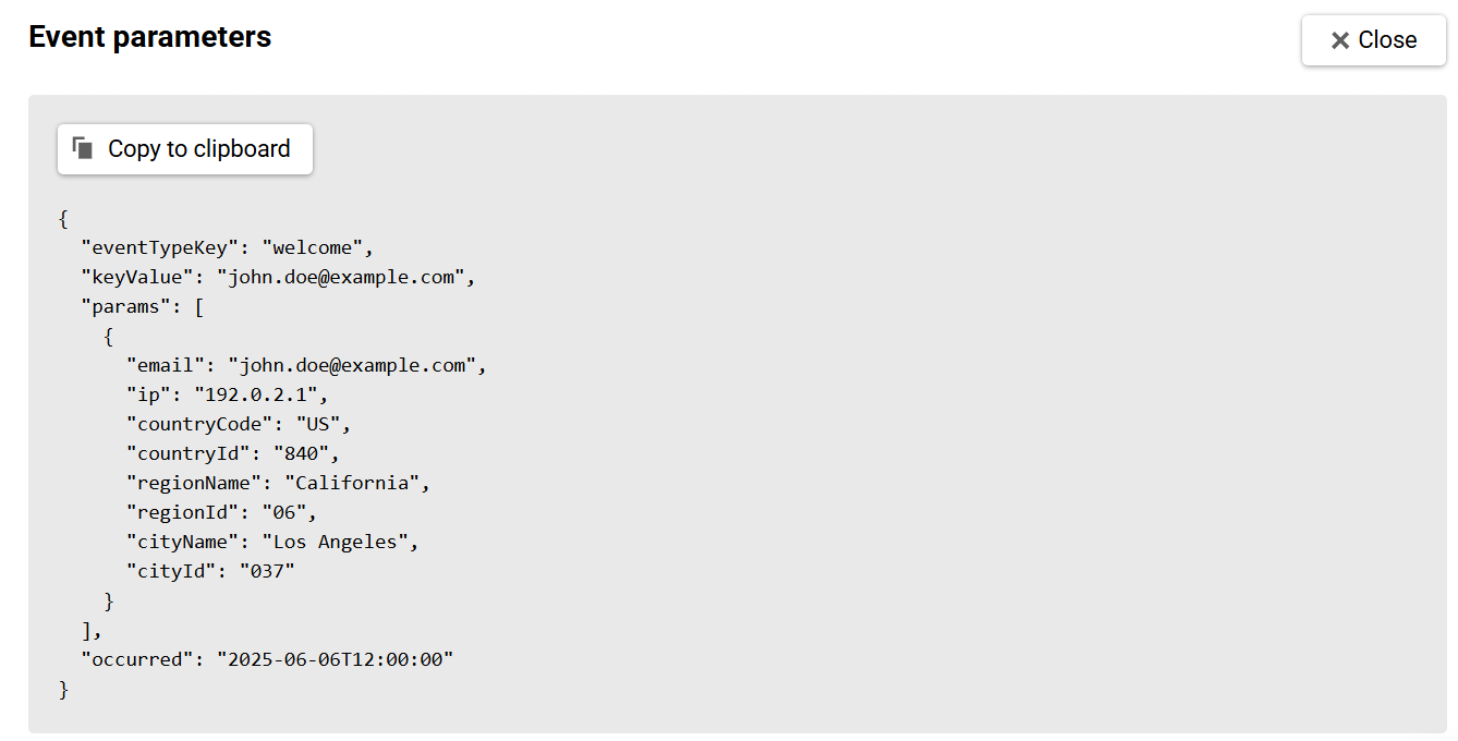 keyValue | string | Event key. Determines event uniqueness. The key must contain a unique value for each contact (for example, email, phone number, external contact id, etc.) If this parameter is not set, params must contain one of the following contact identifiers:
